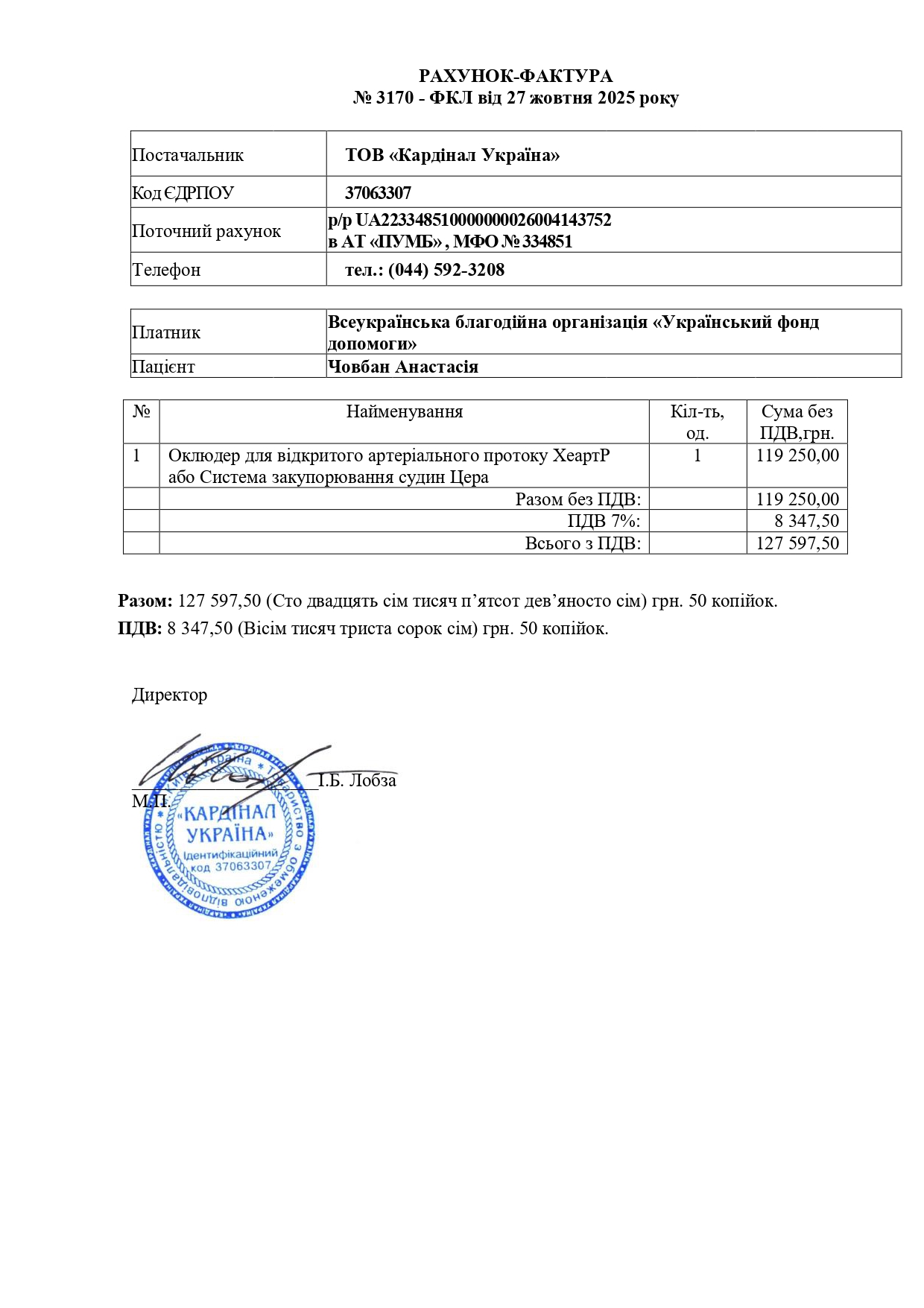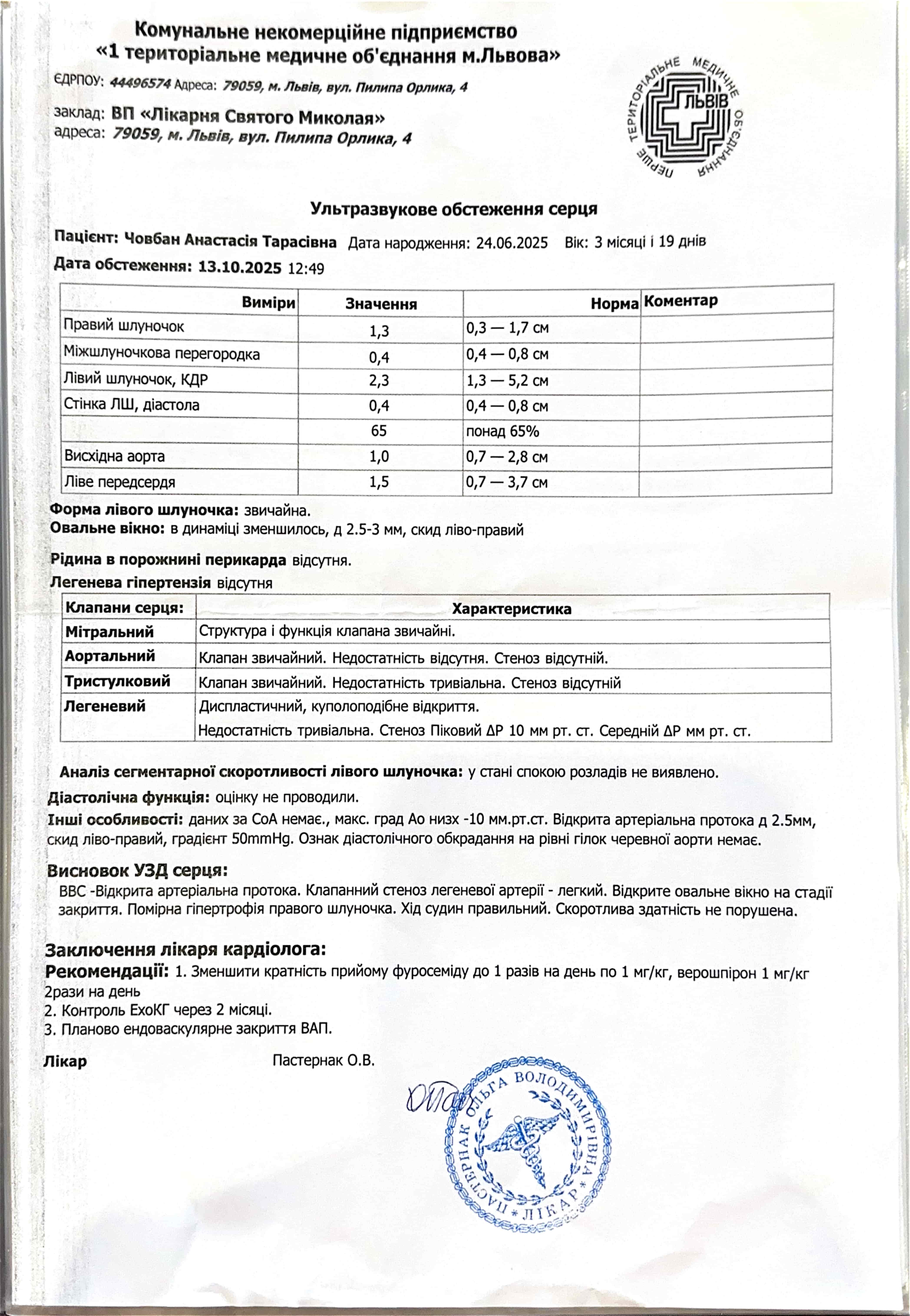 Допоможіть, будь ласка, нашій донечці бути здоровою! Світлана Човбан, Закарпатська область. Серцево-судинний лікар-хірург Першого територіального медичного об‘єднання міста Львова Беш Дмитро: «У Анастасії складна, поєднана вроджена вада серця. Дитині поставлений діагноз відкрита артеріальна протока та відкрите овальне вікно. Є всі показники, що овальне вікно закриється самостійно, артеріальну протоку потрібно закривати ендоваскулярно. При цій ваді серця, легені отримують більше крові і в них підвищується тиск. Крім того, ця вада є фактором ризику розвитку інших захворювань. Оптимальним варіантом лікування даної вади є закриття отвору за допомогою оклюдеру». Постачальник оклюдеру виставив рахунок на 127 597 гривень