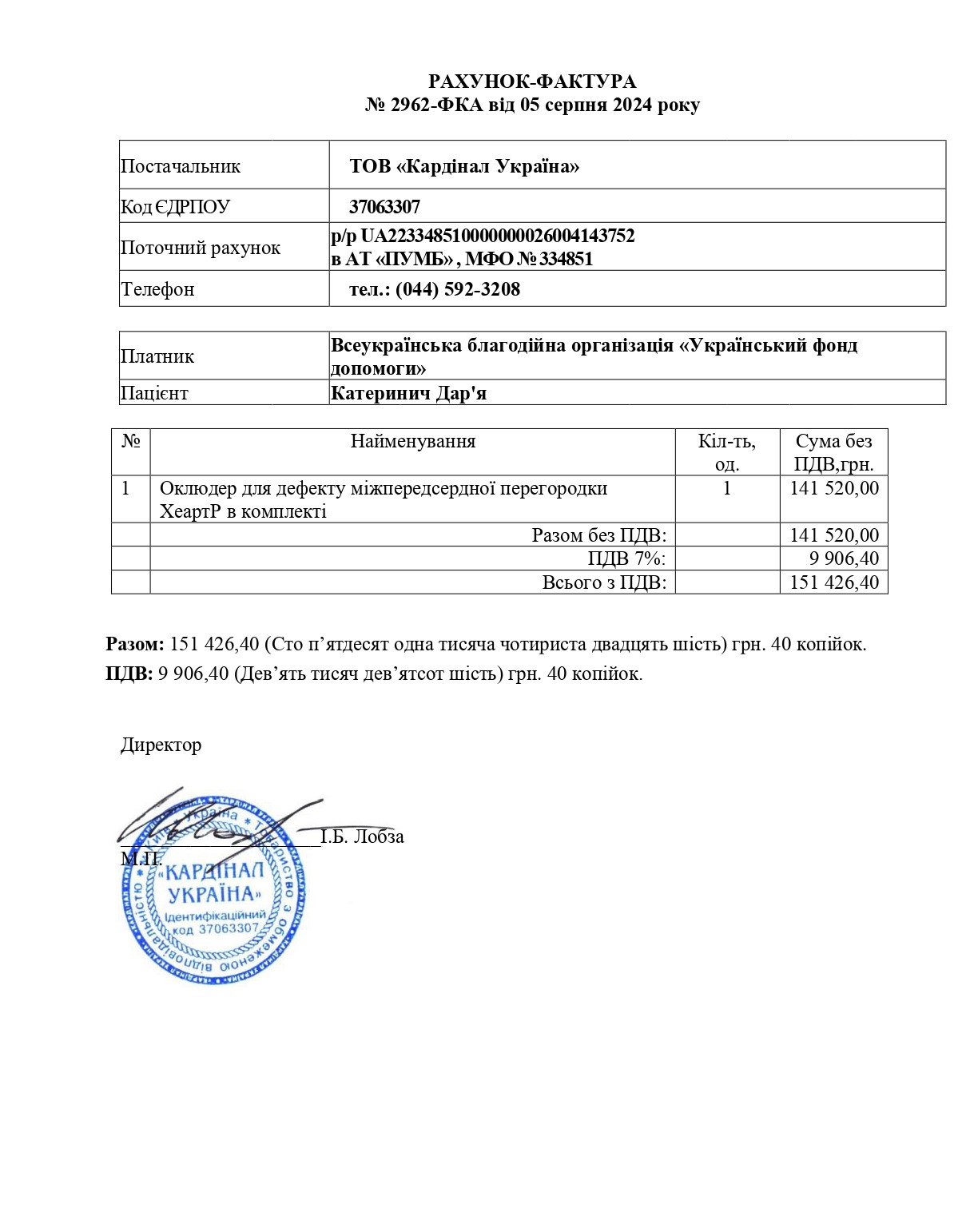 Dasha is our only child. The daughter was born a healthy child, and is growing up as an active girl who is fond of dancing, with the dream of becoming a dance coach in the future. My daughter never complained about any heart problems. Last year, on the advice of our pediatrician, we did an ultrasound of the heart, after which the doctors discovered a congenital heart defect in our daughter - a secondary defect of the atrial septum. The established diagnosis simply shocked us. We were advised to turn to the Amosov Institute, where Dasha was immediately scheduled for surgery: closure of the heart defect by the endovascular method with the help of an occluder. Such an operation should be performed as early as possible, and due to the increase in the size of the hole, as soon as possible. If the hole is not closed now, in the future, this ailment can lead to undesirable consequences: a reduction in the duration and quality of life, other accompanying health problems associated with this heart defect. After the operation, doctors predict a full recovery. However, the cost of the necessary occluder is too high for our family. Therefore, we are forced to turn to caring people for help. Please help our daughter to have a healthy heart and do what she loves. Olga Katerynych, Cherkasy.Head of the Department of Endovascular Treatment of Congenital and Acquired Heart Defects of the National Institute of Cardiovascular Surgery named after N.M. Amosova Ihor Ditkovskiy (Kyiv): «During the examination, the child was diagnosed with a congenital heart defect - an atrial septal defect. There is already an increase in the hole and the load on the left side of the heart. According to absolute indicators, endovascular closure of the defect with an occluder is recommended. This is a gentle intervention, after which the child will quickly recover and will develop normally and do his favorite thing». The occlude supplier issued an invoice for UAH 151 426.