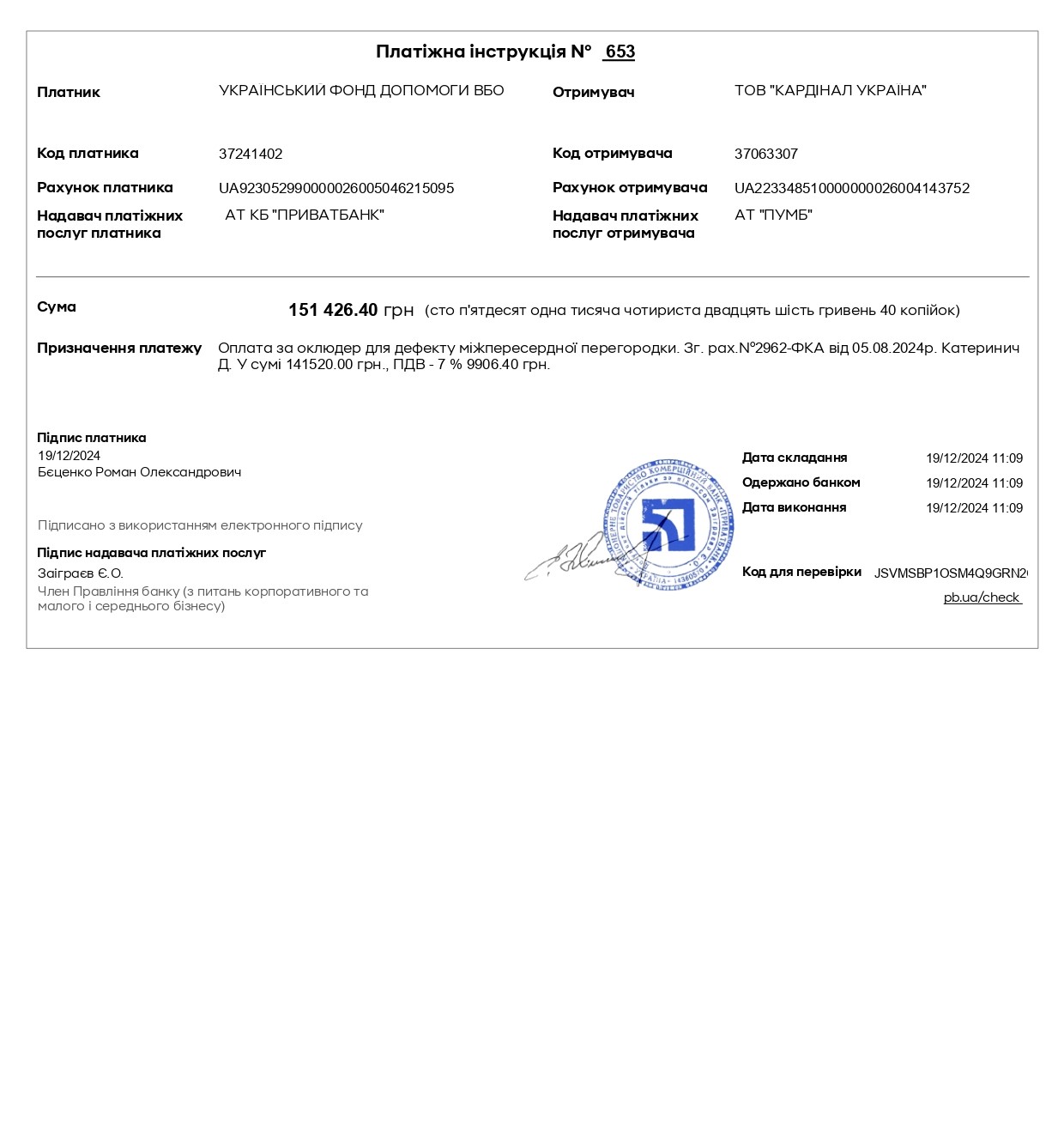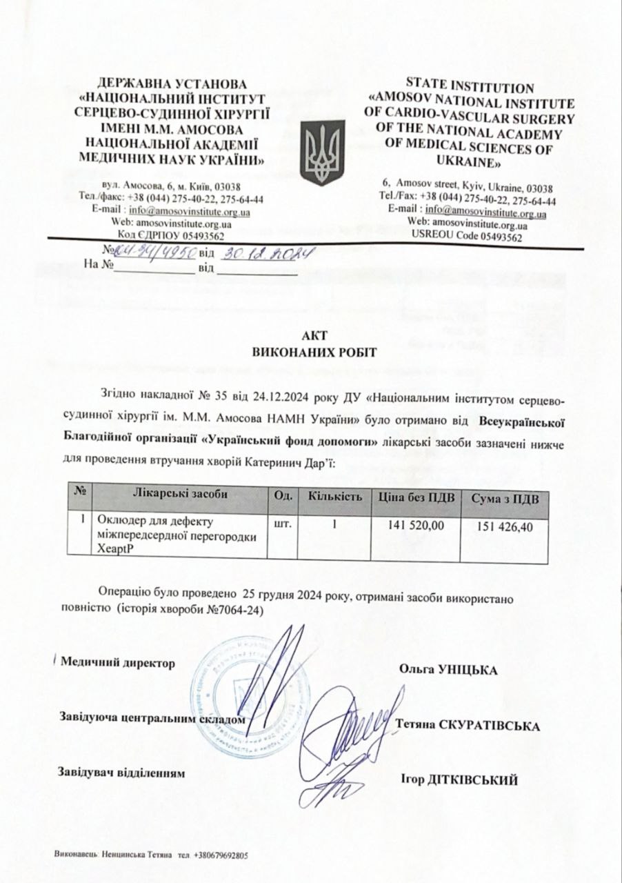 Dear friends! If you decide to help Darya Katerynych, don’t be confused by the price of rescue. Any donation from you will be gratefully received. You can send a donation by bank transfer to the Ufund. All the necessary details are available in the fund and on the website. You can use our electronic payment system, make a donation from a bank card or electronic cash, including from abroad using PayPal: ufondhelp@gmail.com. Also, transfer help to Darya’s using the peering payment system by transferring bitcoins to the Fund’s wallet: 1UFondJDKbYMgVhWsyijyvJoWEGWPggNp.25.12.2024 Daria Katerynych was successfully operated on at the National Institute of Cardiovascular Surgery named after M.M. Amosov. During the endovascular operation, the atrial septal defect was closed through the vessels using an occluder. The operation was gentle and minimally traumatic. According to cardiac surgeon Igor Ditkovsky, the operation went without complications. Heart function indicators are normal, blood circulation has been restored. The girl feels good, and the next day after the operation she was discharged home. Dasha's parents thank the readers and partners of the Ufund for their help and saving their daughter's life! Please accept our gratitude, friends! We will definitely follow the fate of the girl.