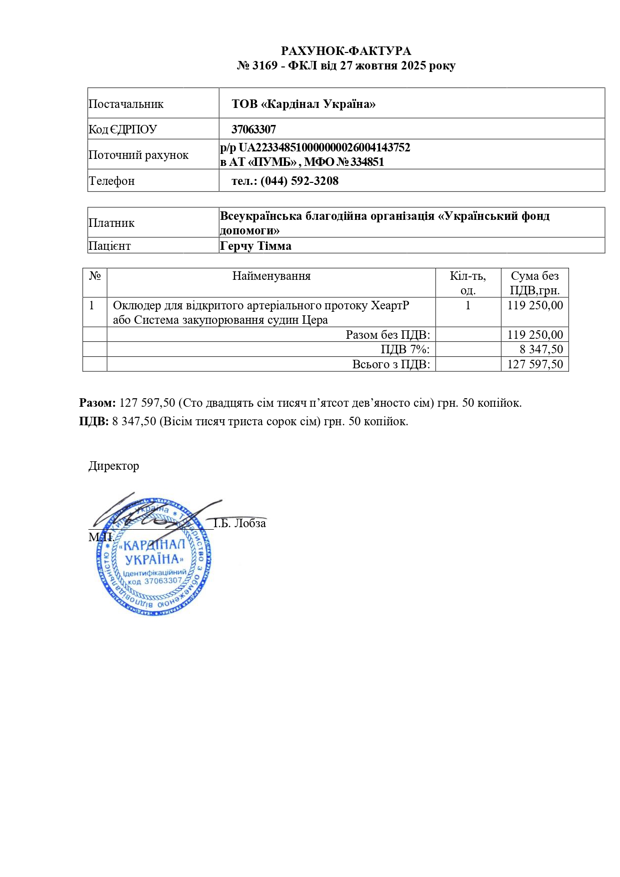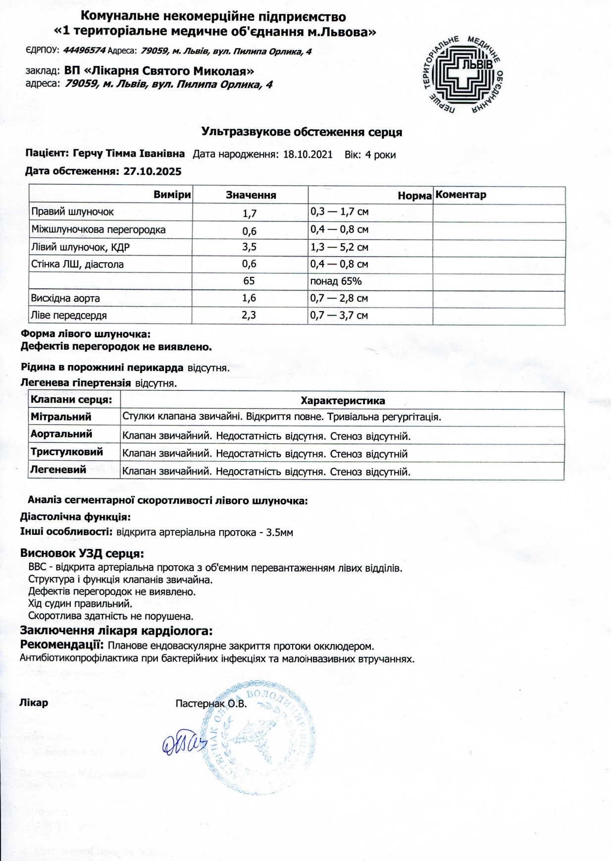 Timmy just recently turned 4 years old. There were no health complications during pregnancy or after the birth of the child. Recently, for unknown reasons, my daughter has been experiencing emotional and nervous stress. On the recommendation of a neurologist, we had to do an MRI, but before that, we must definitely do a heart examination. It was after the heart echo that Timmy was diagnosed with a congenital heart defect - patent ductus arteriosus with volumetric overload of the left ventricle. Doctors advise surgery, because this defect puts a strong strain on the heart and lungs. It needs to be done as soon as possible, because there are many risks: complicated courses of any disease, the risk of any infections, even if it seems insignificant, for Timmy this is a big risk. To perform the surgery, we need an implant - an occluder, which will close the ductus. The cost of the implant is too high for us, and we really need your help! My husband and I are divorced. I appeal to all caring people to help us raise funds, because every donation will bring Timma closer to a healthy heart and her daughter will be able to grow up peacefully and not be afraid of diseases. Tetyana Gerchu, Lviv region. Cardiovascular surgeon of the First Territorial Medical Association of Lviv Besh Dmytro: "During the examination, the child was diagnosed with congenital heart disease - patent ductus arteriosus. Based on absolute indicators, endovascular closure of the opening with an occluder was recommended. This is a gentle intervention, after which the child will recover quickly and develop normally". The occlude supplier issued an invoice for UAH 127 597.